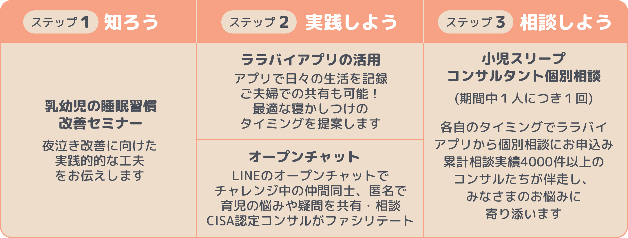- 伴走型サポート:CISA認定小児スリープコンサルタントが、個別の悩みに寄り添って伴走サポート